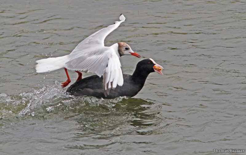 Duel entre une mouette rieuse et un foulque macroule pour un crignon de pain